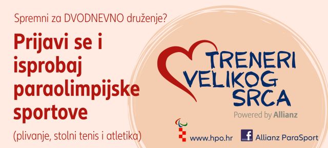 ZAGREB - Allianz i Hrvatski paraolimpijski odbor u sklopu projekta „Treneri velikog srca“ pozivaju djecu s teškoćama u razvoju na Orijentacijski i inovacijski kamp koji će se od 26. do 28. siječnja 2018. održati u Zagrebu. Cilj je ovog dvodnevnog kampa pomoći djeci odabrati sportsku disciplinu po njihovoj mjeri. Pod budnim okom stručnih trenera i poznatih paraolimpijaca djeca će se moći okušati u plivanju, stolnom tenisu i atletici, a osim sportskih uzbuđenja čeka ih i niz drugih aktivnosti ispunjenih smijehom i druženjem.