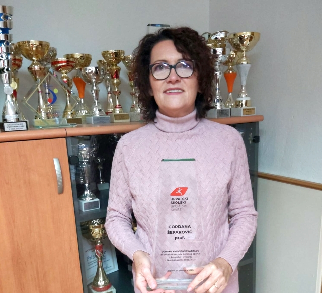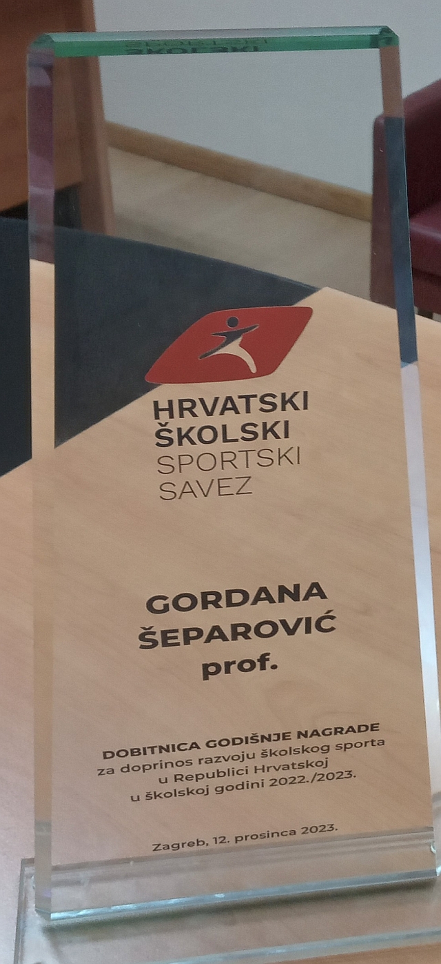 Na Svečanosti Hrvatskog školskog športa održanoj u zagrebačkom Hotelu Westin iz ruku Predsjednika HŠSS-a Zlatka Kraljevića primila je Gordana Šeparović malo je reći - zasluženo priznanje! Jedina iz Dubrovačko-neretvanske županije. Podatak da je Gordani kao mentorici zajedno sa svojim blajskim osnovcima uspjelo u samo jednoj školskoj godini izboriti plasman na čak osam Državnih školski natjecanja je podatak koji sve govori. Niti jednoj školi u našoj županiji nije to uspjelo! Sportskim 'vokabularom' rečeno rekord kojeg će ubuduće bilo koja od osnovnih, ali i inih škola sa ovog našeg područja teško oboriti.