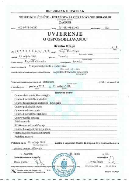 Uz Marina veliki uspjeh je uz sve financijske poteškoće ostvario i njegov trener ing. Branko Džajić koji je na Sportskom učilištu Zagreb, kao prvi i jedini iz Dubrovačko-neretvanske županije završio trenersku školu i postao licencirani trener udičarenja.